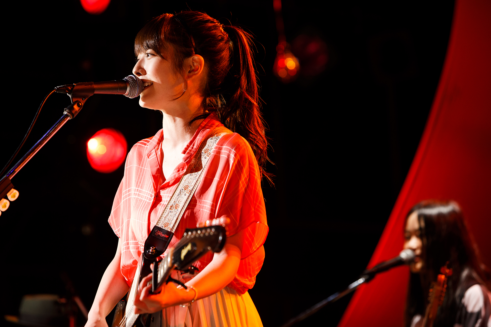 間髪入れず、ピアノのイントロが鳴り、披露されたのは、『銀河鉄道の降り方』だ。彼女の力強い歌声が会場を包み、幻想的な世界を見事に作り出していた。続いて、演奏されたのは『ふたりよがり』。ゆったりとした心地よい雰囲気が流れ、美しい彼女の裏声も心地良い。ここでアコースティックギターに持ち替え、彼女の生まれた年がタイトルになっている『1991』が歌われる。ドラムのリズムに合わせて大きな手拍子が巻き起こり、会場がひとつになる。