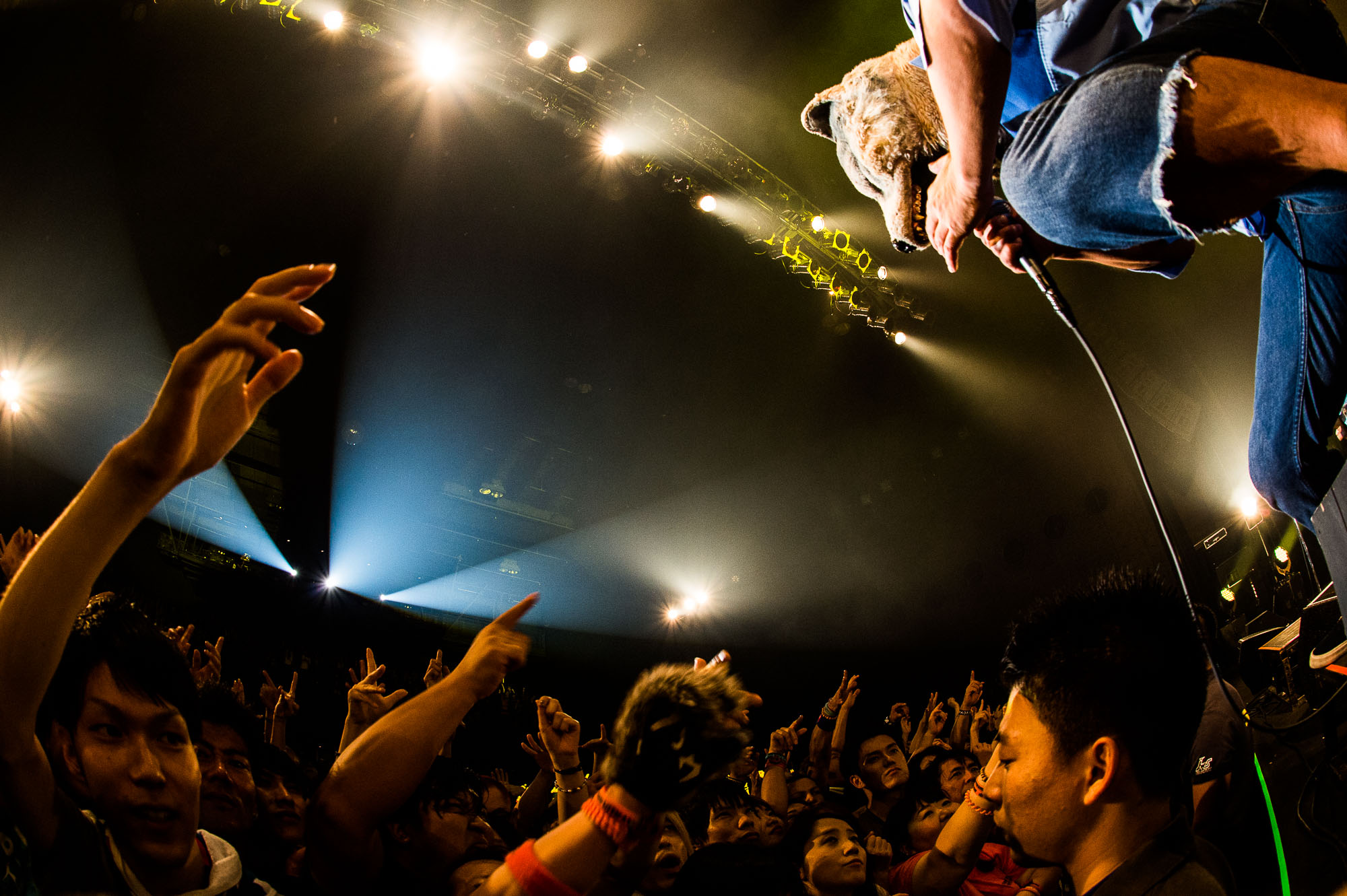 20分のインターバルのうちに、気付けばフロア前方はすっかり男性率が急上昇。ステージ最前には横幅2メートル近いお立ち台が3台並ぶ。上手にはヒュース&ケトナー、下手にはEVH、そしてDrを挟んで左右にEDENが2セット、それぞれ2段積みのアンプキャビが壁を作り、中心にはフロントヘッドに“眼”をプリントした2バスがフロアに睨みを据える。シンプルながら壮観なセットに高まる緊張と興奮。グロテスクな仮面を外したカリスマ・ボーカリストがいよいよ登場するのだ。抑えていた高揚感は、場内の暗転とともに怒涛の奔流となって解き放たれた。