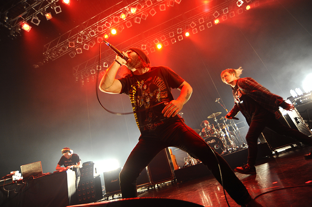 そしていよいよイベントがスタート。トップバッターは、今回東京のみの出演となったボーカル、ギター、ドラム、エレクトロニクスという変則的な編成からなる4人組ロック・バンド、アメリカのGhost Town。名門レーベル、FUELED BY RAMENに所属し、昨年はVANS WARPED TOUR ’14にも参加。一気に注目が高まっている中、この日のステージも1曲目『TRICK OR TREAT』からフロアを掻き回しに掛かってくる。途中、ギターのアリックスはギターを置きボーカルを担当したりと、トリッキーなステージにグイグイ引き込まれて行く。ボーカルのケヴィンが「ミナサン!テヲアゲテ!」と叫び、フロアを左右に揺れる腕で埋め尽くした『TENTACLES』では、その妖艶な美メロに観客も酔いしれる。『UNDER WRAPS BRIDGE』で再び観客の腕が左右に揺られ、ラストは昨年リリースされたアルバム[THE AFTER PARTY]に収録されているナンバー、『YOU’RE SO CREEPY』をプレイし、そのステージを終えた。