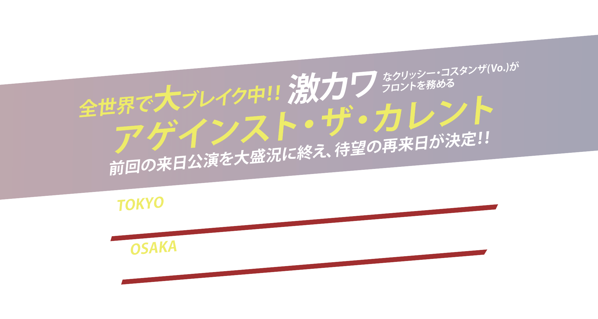 アゲインスト・ザ・カレントは、2006年に結成され、ニューヨーク州をベースに活動するバンド。当初は、男性のみの4人組バンドだったが、YouTubeでカヴァー曲をあげ、注目が集まり始めていたクリッシー・コスタンザ(ヴォーカル)が加入。現在はクリッシー、ダン・ガウ(ギター、ヴォーカル)、ウィル・フェリ(ドラム)の3人で活動中。今までにデジタル販売のみで2枚のEP『Infinity』(2014年)、『Gravity』(2015年)を発売。もともとYouTubeにあげた彼らのヒット曲のカヴァー(総再生回数1億超え)が世界中で話題となり、今、まさにYouTube発のアーティストとして注目を集めている。ちなみに話題を集める大きな理由はクリッシー(1995年8月23日生まれ)の間違いない歌唱力と見た目の可愛さ、そしてセンスの良いカヴァーアレンジ。現在、彼女のチャンネルの登録者数は、49万人超え。アーティストとしての一面だけではなく、彼女はメイクアップ動画を公開したり、彼女の私生活にも触れることができ、さらにファンが増えている。日本でも「クリッシー・コスタンザを呼ぼう」的なスレッドも目にするようになってきた。ちなみにバンドのチャンネル登録者数は103万人超え。配信のみでリリースしたEPは日本のみならず、アジア圏で好成績を残している。そんな彼女たちは2015年3月4日にパラモア、FUN.、TWENTY ONE PILOTSなどが所属する FBR(FUELED BY RAMEN)とメジャー契約したことをYouTubeで発表した。そして、2015年5月にリリースした日本デビュー・アルバム『グラヴィティ』の『ドリーミング・アローン feat. Taka』にはONE OK ROCKのTAKAがゲスト・ボーカルとして参加。アルバムのツアーとして、アメリカ、ヨーロッパ、アジアのワールドツアーを決行し、9月にONE OK ROCK 2015“35xxxv”JAPAN TOURの追加公演となる幕張メッセ2DAYSの初日にサポート・アクトとして出演した。また、それに伴い単独公演も開催、ソールドアウトにて初来日公演を大盛況に終え、翌月10月にはデジタル配信で新曲「Outsiders」をリリースし、2016年9月に待望の再来日公演が決定した。