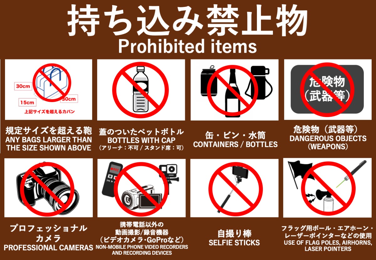 [更新]以下に加え、アリーナ席のお客様は、規定サイズの鞄の中に入る折り畳み傘を除く傘の持ち込みも禁止いたします。雨天の際は折り畳み傘をご使用ください。スタンド席のお客様は規定鞄サイズを超える傘もお席にお持ち込みいただけます。